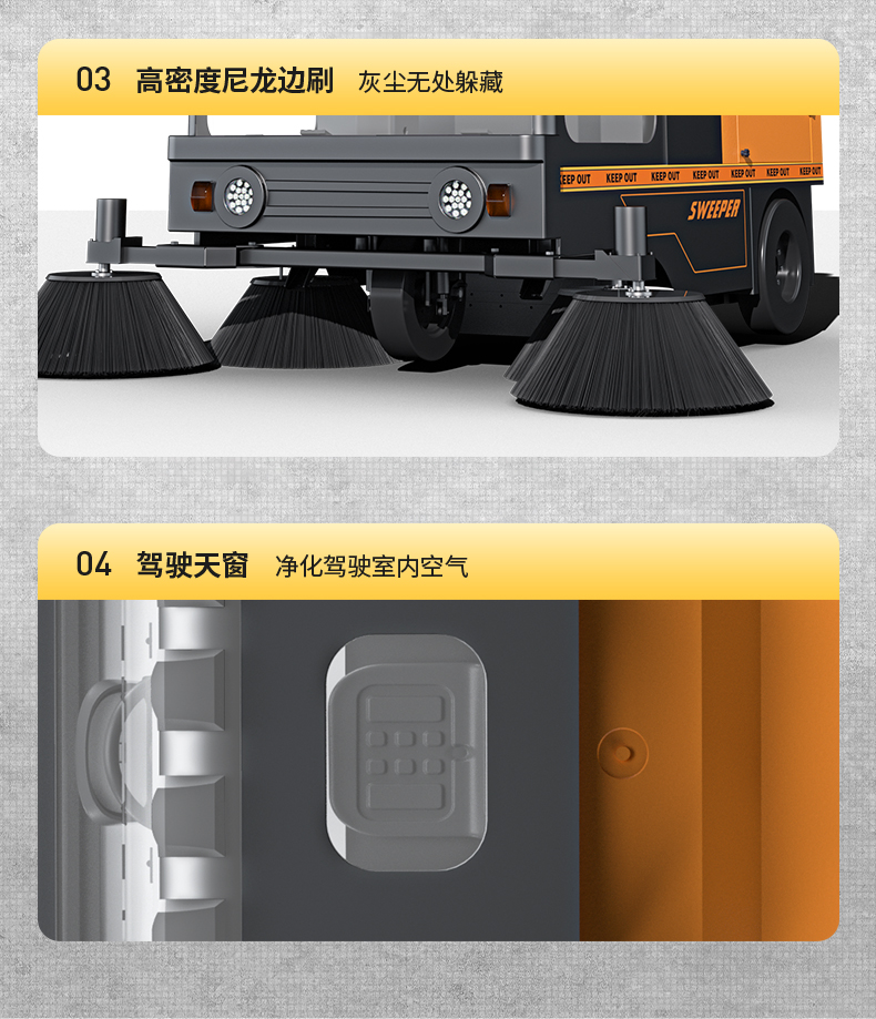 榮事達(dá)RS-CAR200 駕駛式掃地機(jī)配備了雙吸風(fēng)電機(jī),采用過載欠壓保護(hù)裝置,使用更加安全,駕駛式掃地機(jī)不僅配備了自主研發(fā)的邊刷電機(jī),而且還使用聚氨酯實心胎 和大容量垃圾箱,配件品質(zhì)高,也提升了使用的性能。 電動掃地車廠家配置了吸塵濾芯,避免了掃地車操作過程中的清掃遺漏問題,能夠?qū)崿F(xiàn)電動振塵,全封閉的駕駛艙,實現(xiàn)了防雨防塵,滿足戶外道路、公園等場所的使用需求。